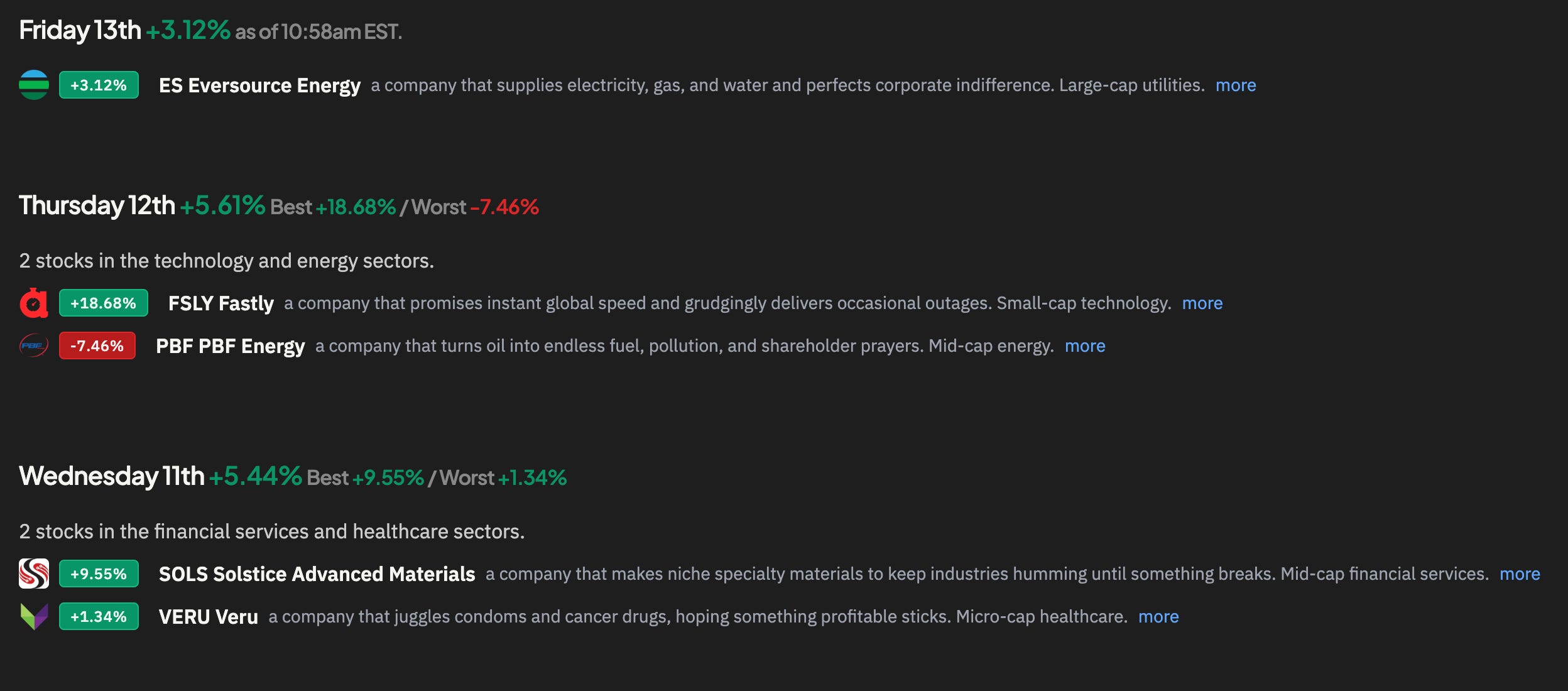 This week the approved analysts have been making some good decisions. There were no serious failures or bugs this week, the system listened into around 50 calls at a time each morning and executed the orders for stocks it liked.