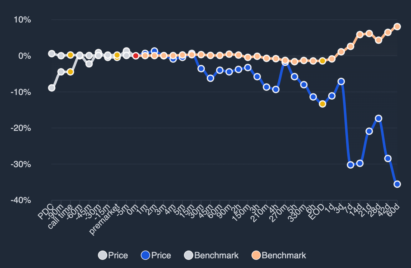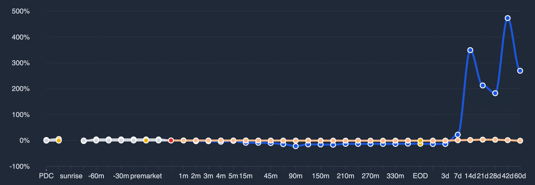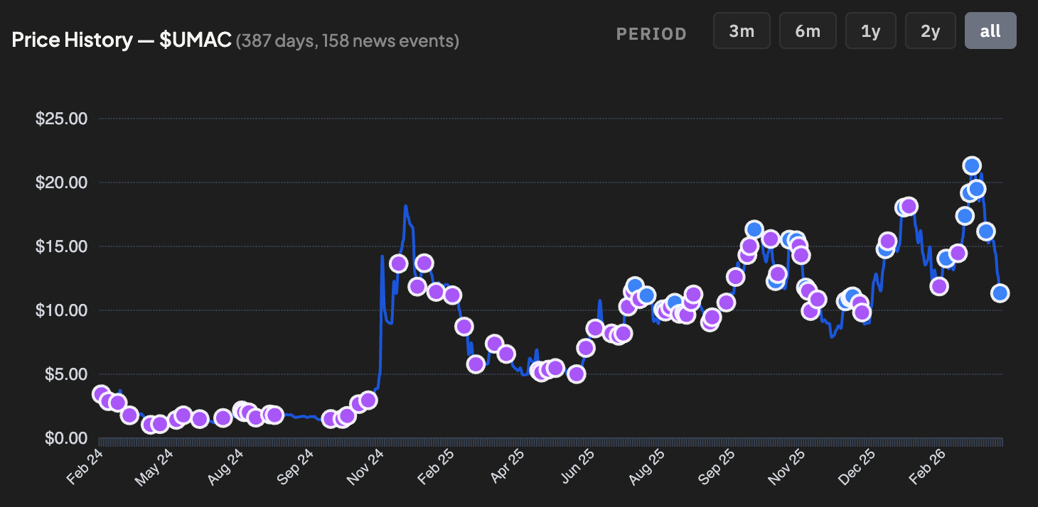 This was a company whose most significant milestone was getting a flight controller approved for the Blue UAS Framework, a U.S. Department of Defense program for vetted drone components - an impressive achievement, which barely moved the price until sharp drop two months later.